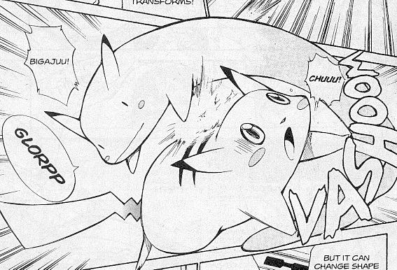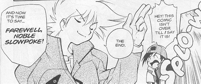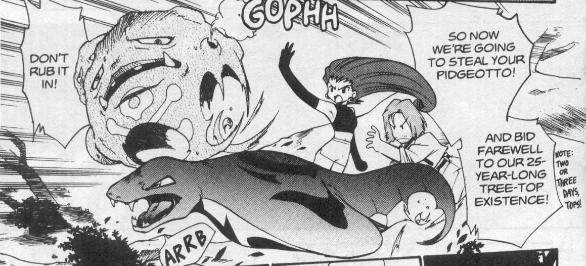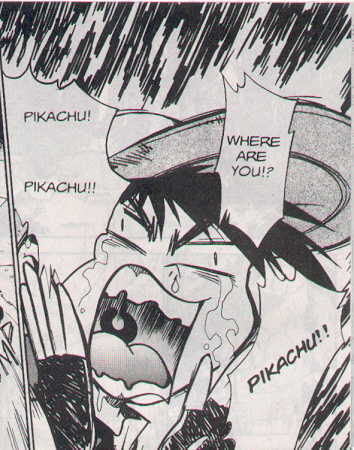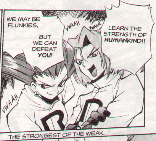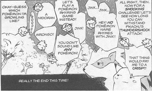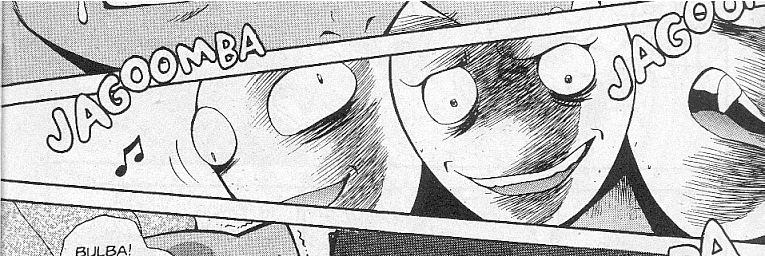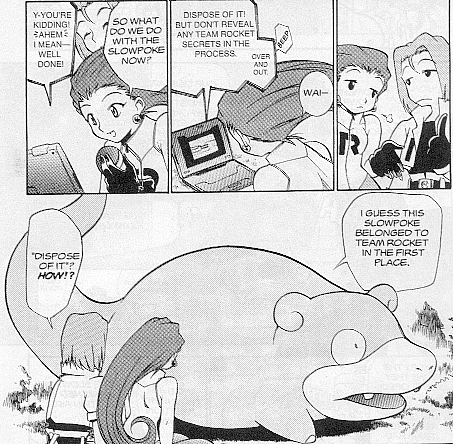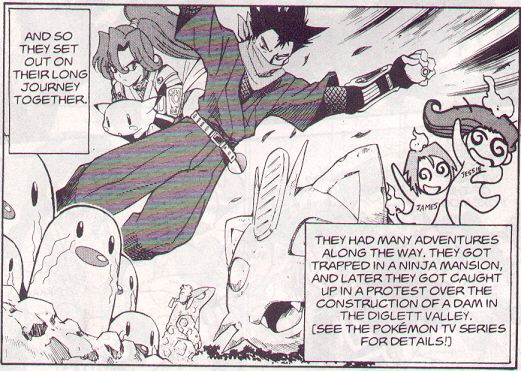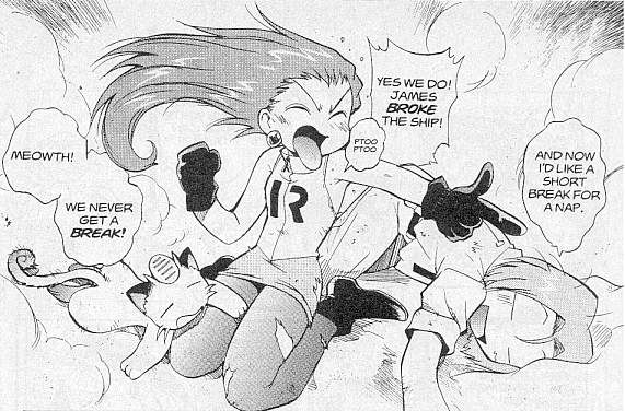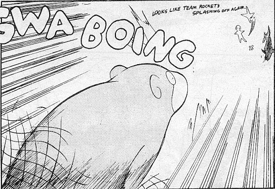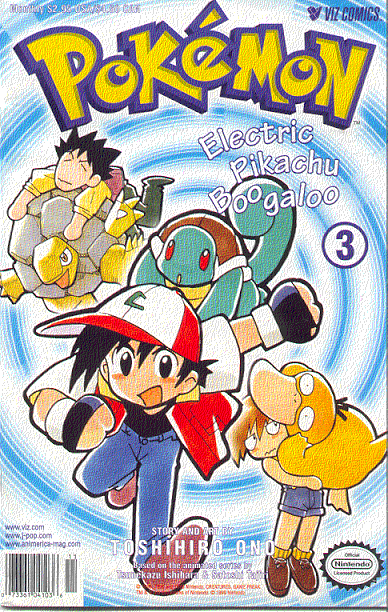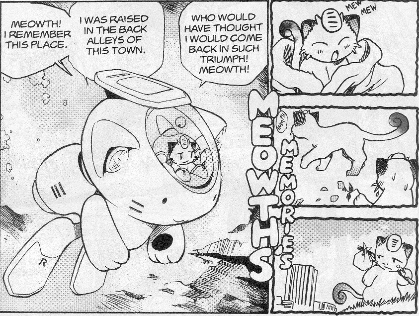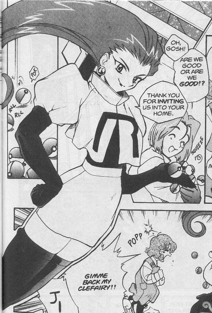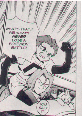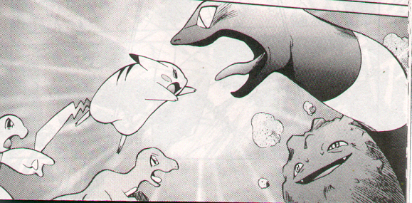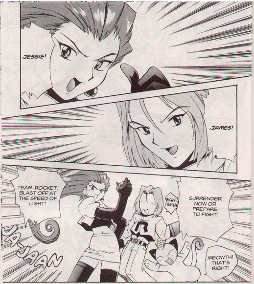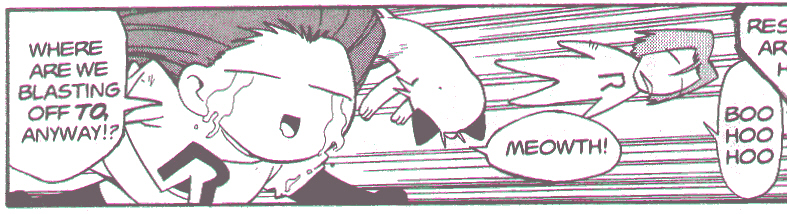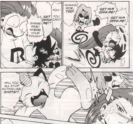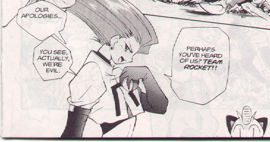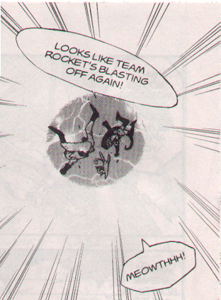 Pokemon is a Video Game turned Anime turned Manga about a ten year old boy named Satoshi who vows that he will be the greatest Pokemon master ever and will catch every last Pokemon there is. A Pokemon is one of over 250 species of animal-like things that inhabit his universe. You must collect these "pocket monsters" and battle them amongst themselves to make them stronger and let them defeat more and more opponents. To become a Pokemon master, Satoshi must earn badges (obtained by defeating various gym leaders in pokemon combat) so he will be able to enter competition in the Indigo League championships. There are other leagues out there however, such as the Orange League and the Johto League (not covered in the manga, in Pokemon Gold/Silver). The manga itself was originally called Dengeki Pikachu and was illustrated by Toshihiro Ono. The translation, featured here, was simply called Pokemon and was released in four parts: "The Electric Tale of Pikachu" (which does not appear in this gallery), "Pikachu Shocks Back", "Electric Pikachu Boogaloo", and "Surf's Up, Pikachu!" It was translated and released by Viz communications. For the record, Satoshi's name is Ash Ketchum in the English version. I'm sure that summary will benefit one or two people out there who don't know what Pokemon is -_^ These scans are a byproduct of the anhillation of the Team Rocket Palace manga summaries. Since the page is about Team Rocket, most of these scans will be Roketto Dan-centric. ![]() |