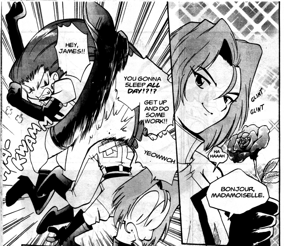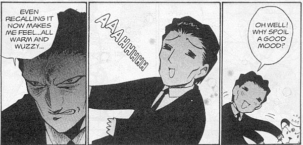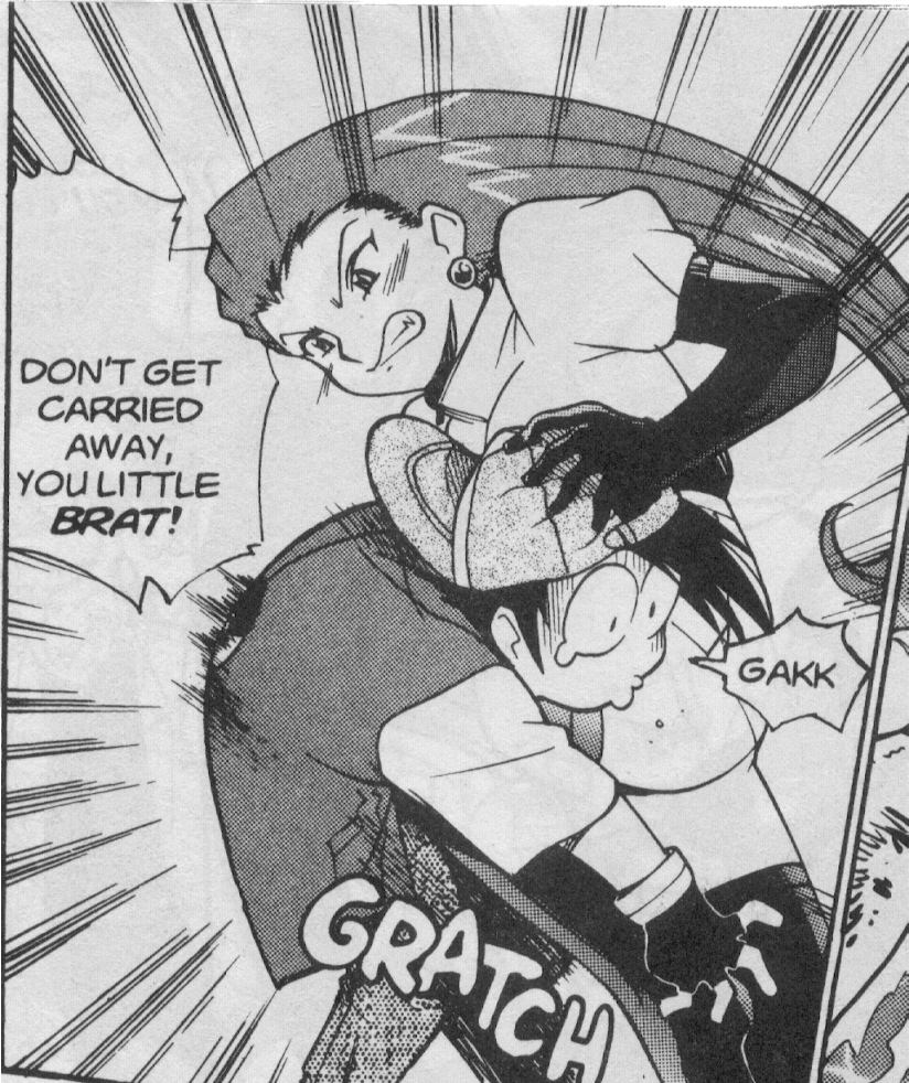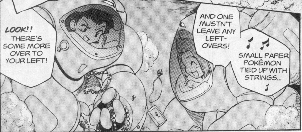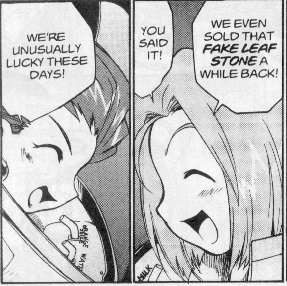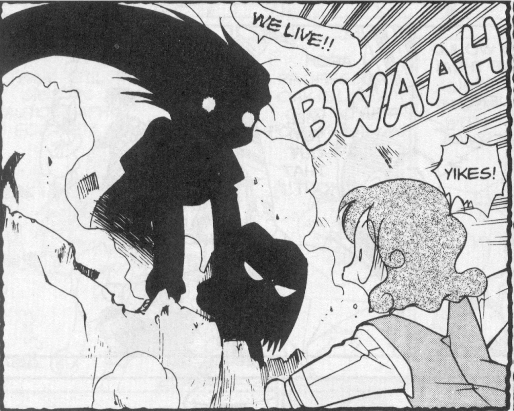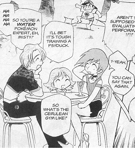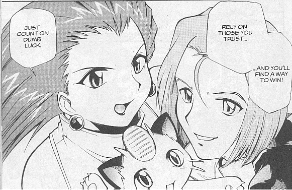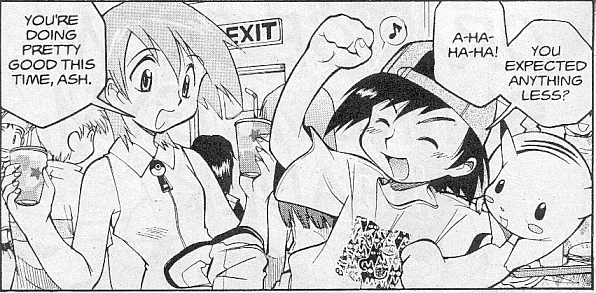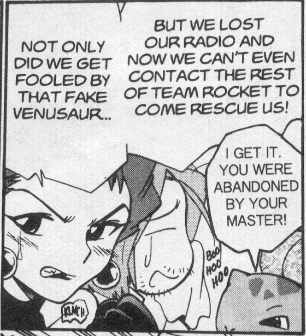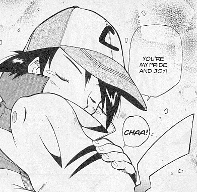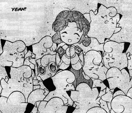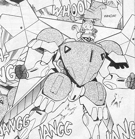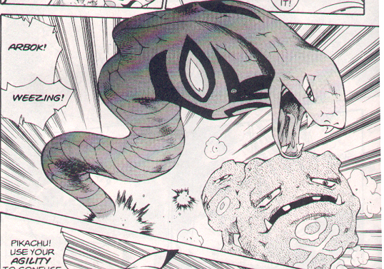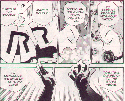 Pokemon is a Video Game turned Anime turned Manga about a ten year old boy named Satoshi who vows that he will be the greatest Pokemon master ever and will catch every last Pokemon there is. A Pokemon is one of over 250 species of animal-like things that inhabit his universe. You must collect these "pocket monsters" and battle them amongst themselves to make them stronger and let them defeat more and more opponents. To become a Pokemon master, Satoshi must earn badges (obtained by defeating various gym leaders in pokemon combat) so he will be able to enter competition in the Indigo League championships. There are other leagues out there however, such as the Orange League and the Johto League (not covered in the manga, in Pokemon Gold/Silver). The manga itself was originally called Dengeki Pikachu and was illustrated by Toshihiro Ono. The translation, featured here, was simply called Pokemon and was released in four parts: "The Electric Tale of Pikachu" (which does not appear in this gallery), "Pikachu Shocks Back", "Electric Pikachu Boogaloo", and "Surf's Up, Pikachu!" It was translated and released by Viz communications. For the record, Satoshi's name is Ash Ketchum in the English version. I'm sure that summary will benefit one or two people out there who don't know what Pokemon is -_^ These scans are a byproduct of the anhillation of the Team Rocket Palace manga summaries. Since the page is about Team Rocket, most of these scans will be Roketto Dan-centric. ![]() |